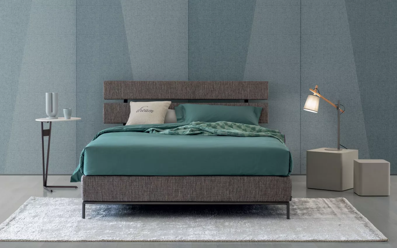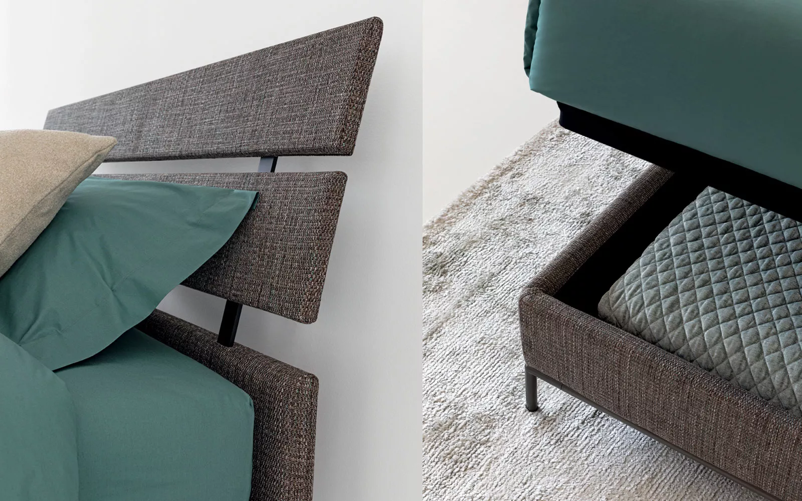 Letto imbottito dalle linee essenziali con accurati dettagli sartoriali, completamente sfoderabile.
