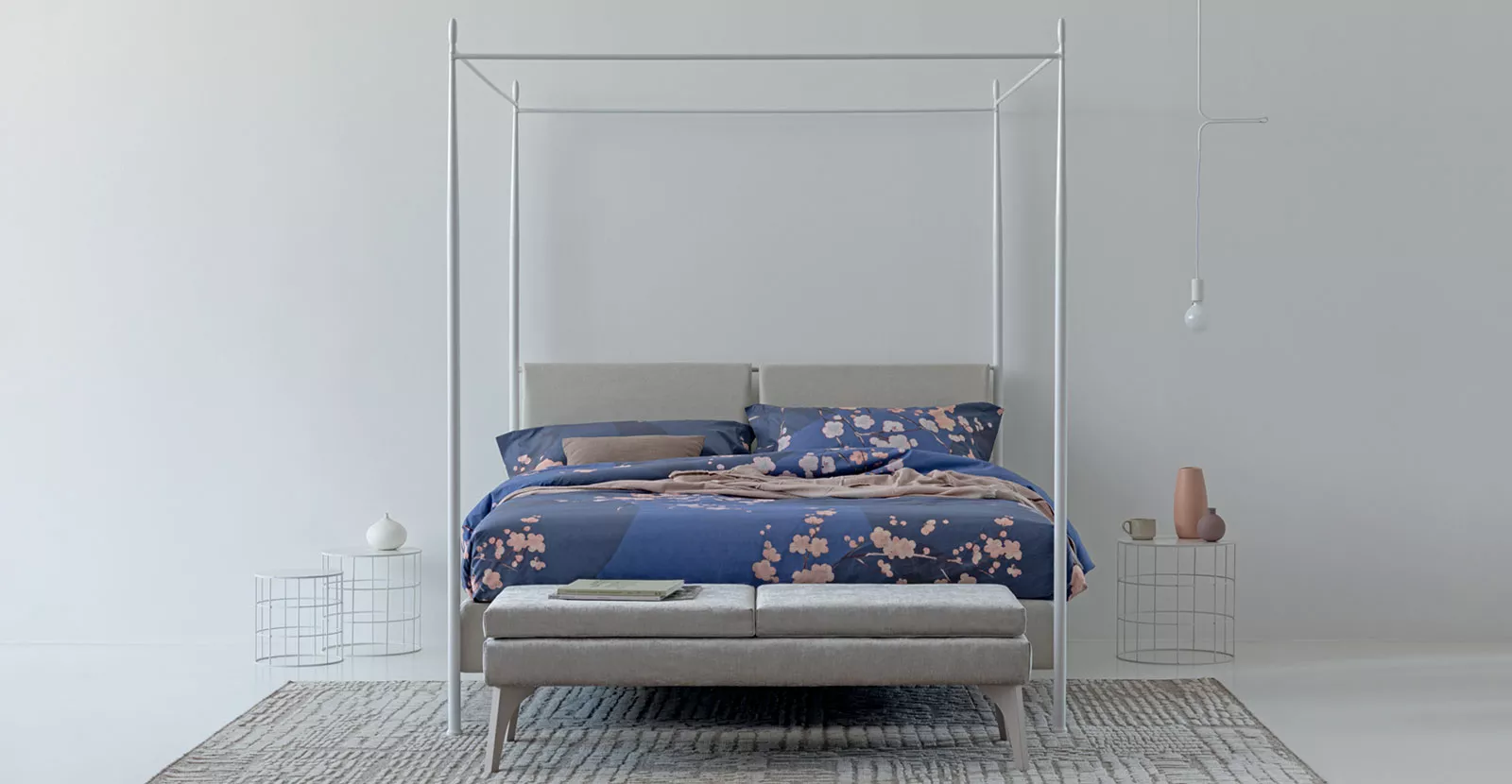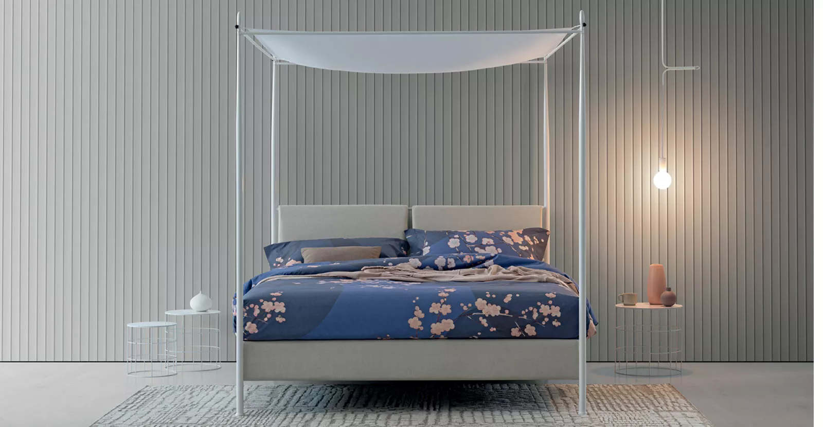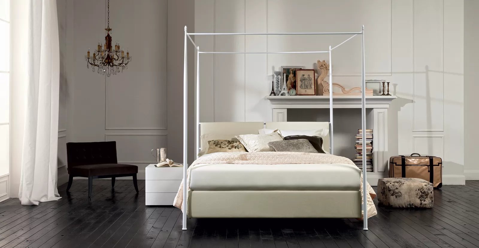 Letto a baldacchino in metallo con base tessile completamente sfoderabile.