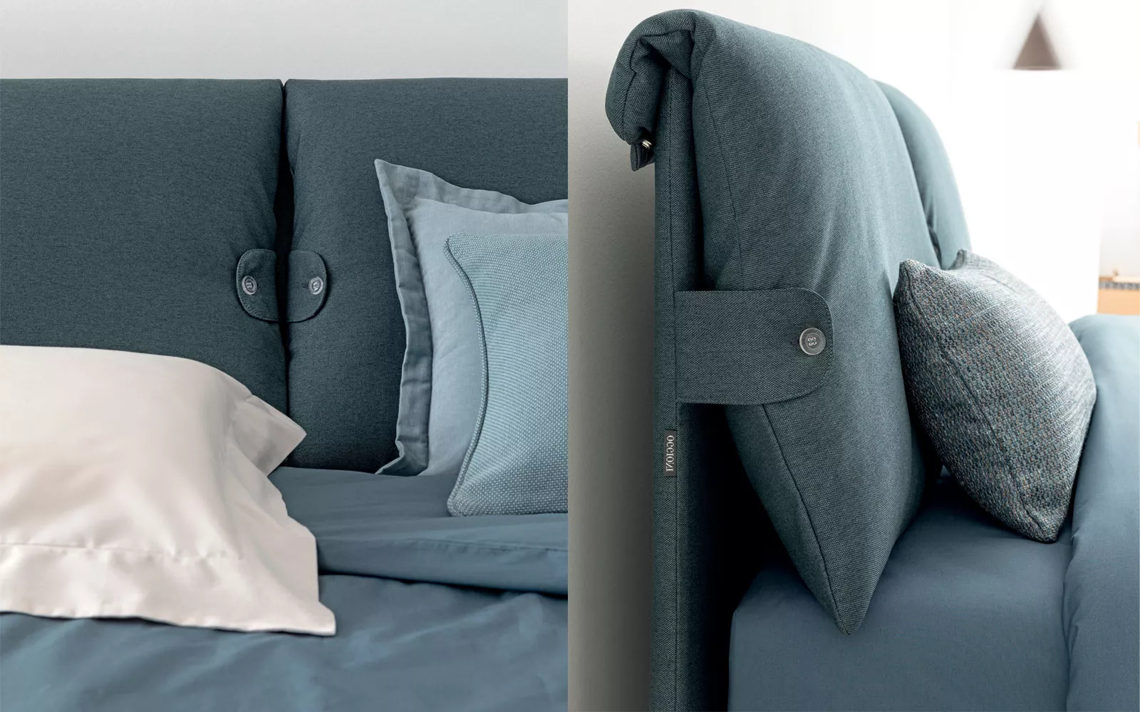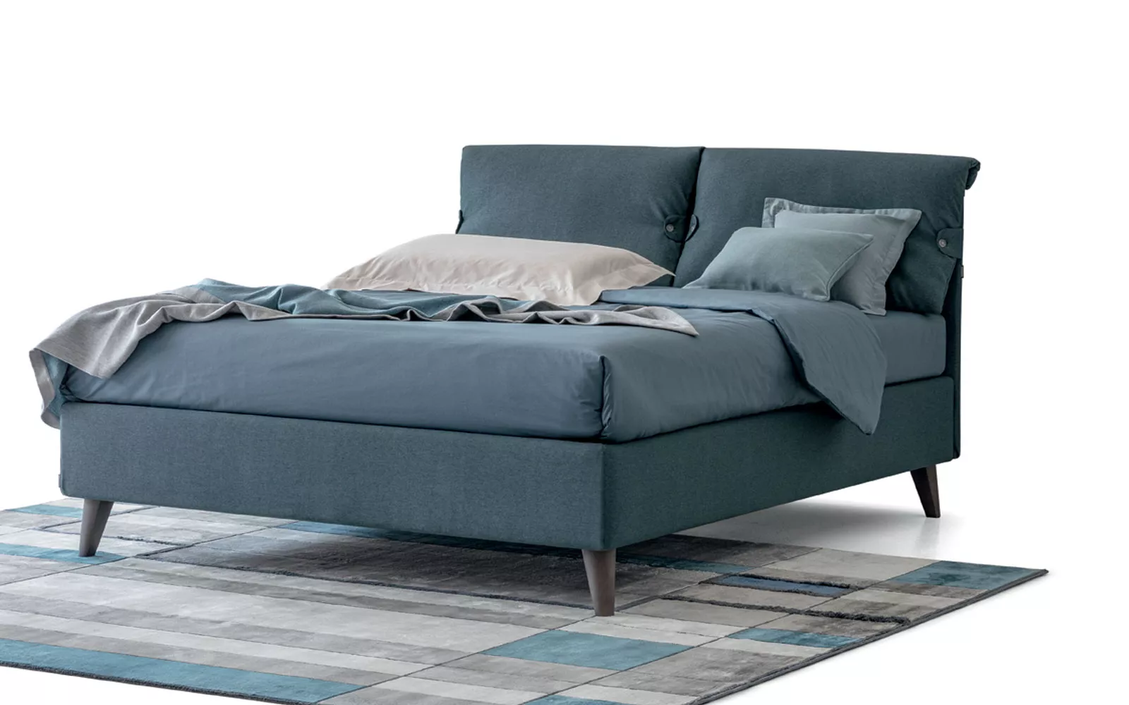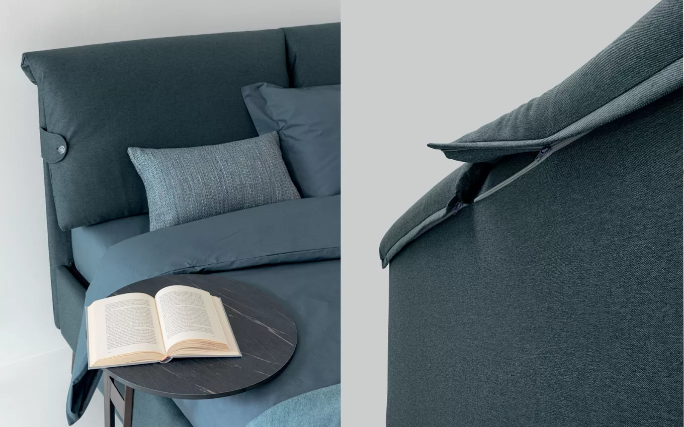 Letto tessile con morbide imbottiture rifinite da bottoni laterali, completamente sfoderabile.