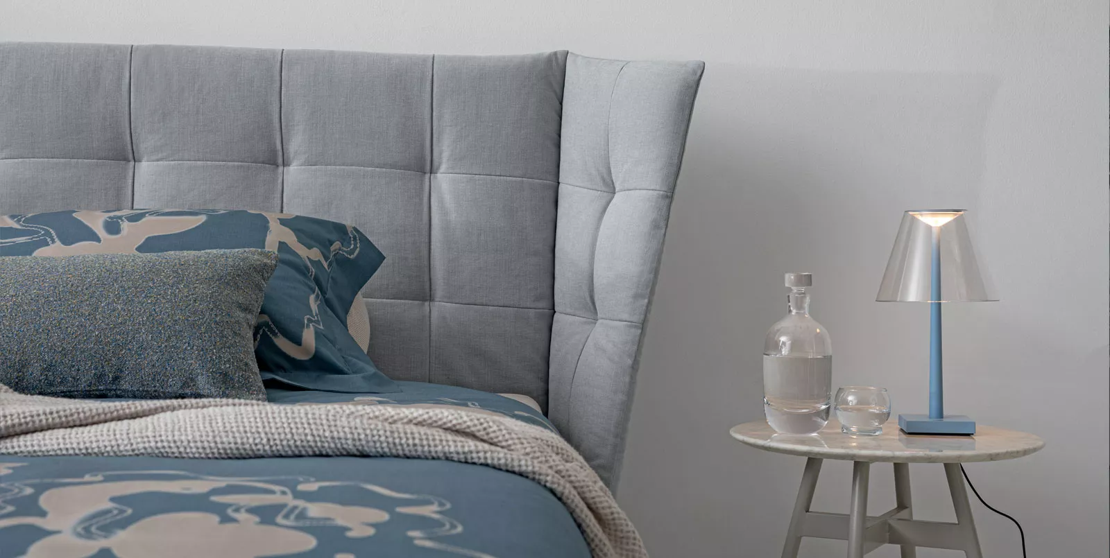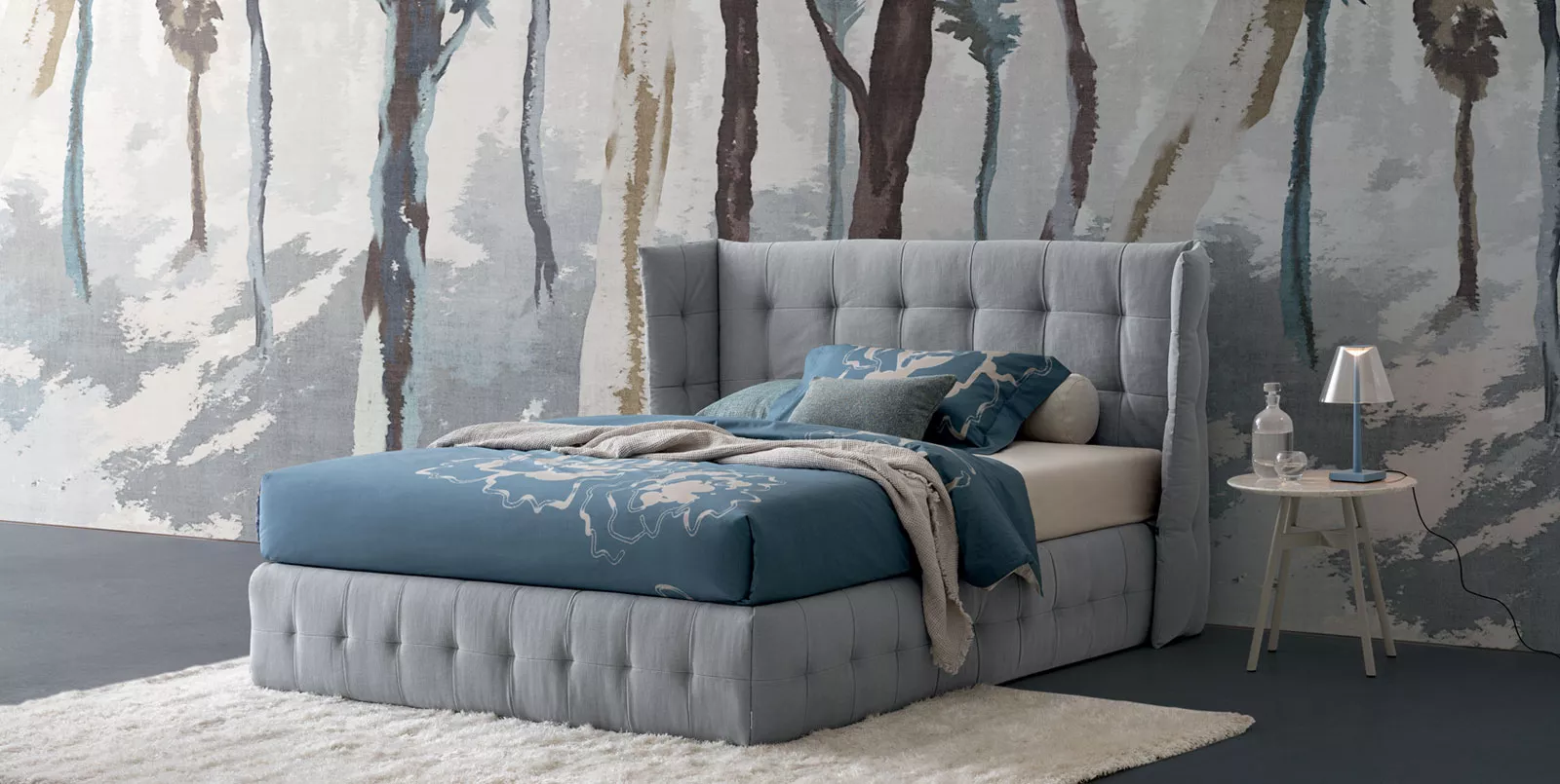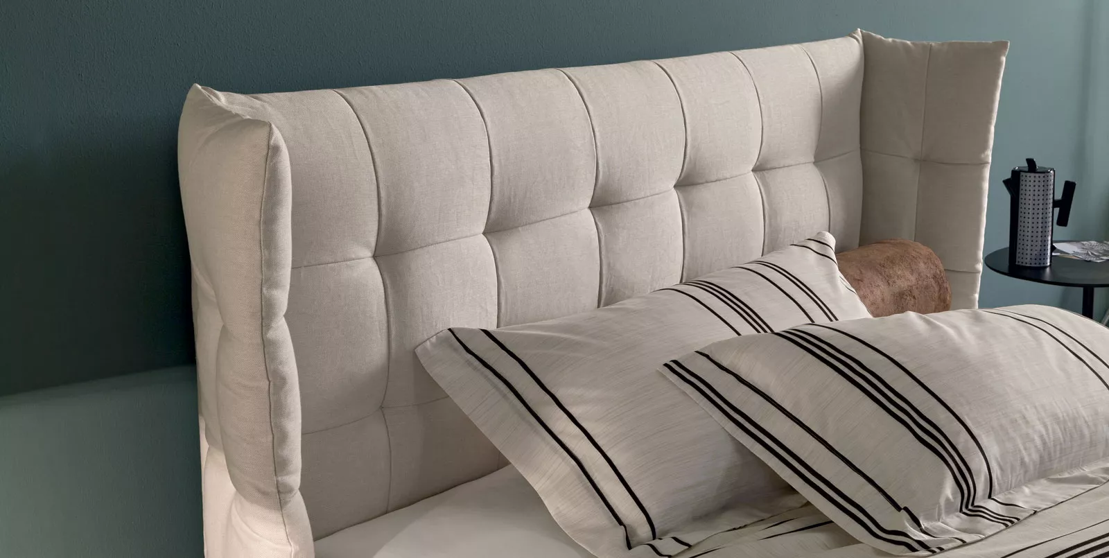 Letto imbottito con rivestimento sapientemente trapuntato sulla base e sulla testiera avvolgente con morbidi risvolti laterali.